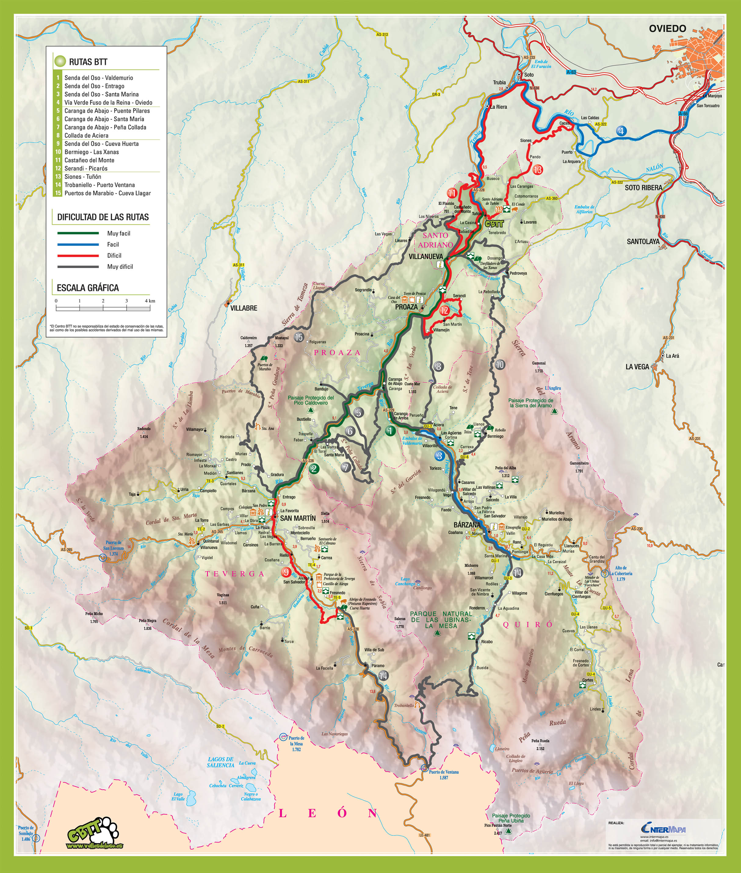 Los Valles del Oso, tiene innumerables posibilidades para la Btt, por lo que nuestro Centro, ha delimitado un total de 350 km, separados en diferentes rutas, que se identifican mediante un código de colores, y con la peculiaridad de que no están marcadas. Dispone del track GPS de cada una de las rutas, pulsando sobre el icono correspondiente. En Centro Btt, no se hace responsable del estado de conservación de las rutas, ni de los posibles accidentes ocasionados, por el uso indebido de las mismas.